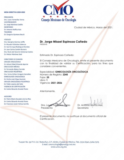 Soy el Dr. Jorge Espinoza Cañedo, Médico Cirujano y Partero egresado de la Universidad de Guadalajara. Me especialicé en Ginecología y Obstetricia y cursé la subespecialidad en Oncología Ginecológica en el Hospital CMNO del IMSS.